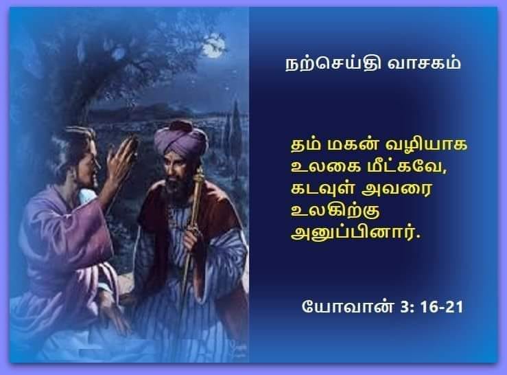 இயேசு நிக்கதேமிடம் கூறியது: தம் ஒரே மகன்மீது நம்பிக்கை கொள்ளும் எவரும் அழியாமல் நிலைவாழ்வு பெறும் பொருட்டு அந்த மகனையே அளிக்கும் அளவுக்குக் கடவுள் உலகின்மேல் அன்புகூர்ந்தார். உலகிற்குத் தண்டனைத் தீர்ப்பளிக்க அல்ல, தம் மகன் வழியாக அதை மீட்கவே கடவுள் அவரை உலகிற்கு அனுப்பினார். அவர்மீது நம்பிக்கை கொள்வோர் தண்டனைத் தீர்ப்புக்கு ஆளாவதில்லை; ஆனால் நம்பிக்கை கொள்ளாதோர் ஏற்கெனவே தீர்ப்புப் பெற்றுவிட்டனர். ஏனெனில் அவர்கள் கடவுளின் ஒரே மகனிடம் நம்பிக்கை கொள்ளவில்லை.
