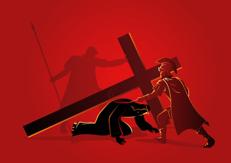 இயேசு நாதர் சிலுவையைச் சுமப்பதற்கு சீமோன் உதவி செய்கிறார்.