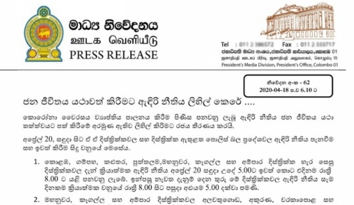 கொழும்பு, கம்பஹா, களுத்துறை, புத்தளம், கண்டி, கேகாலை, மற்றும் அம்பாறை மாவட்டங்கள் தவிர்ந்த 18 மாவட்டங்களின் ஊரடங்கு சட்டம் தளர்த்தப்படுவதாக அறிவிக்கப்பட்டுள்ளது.